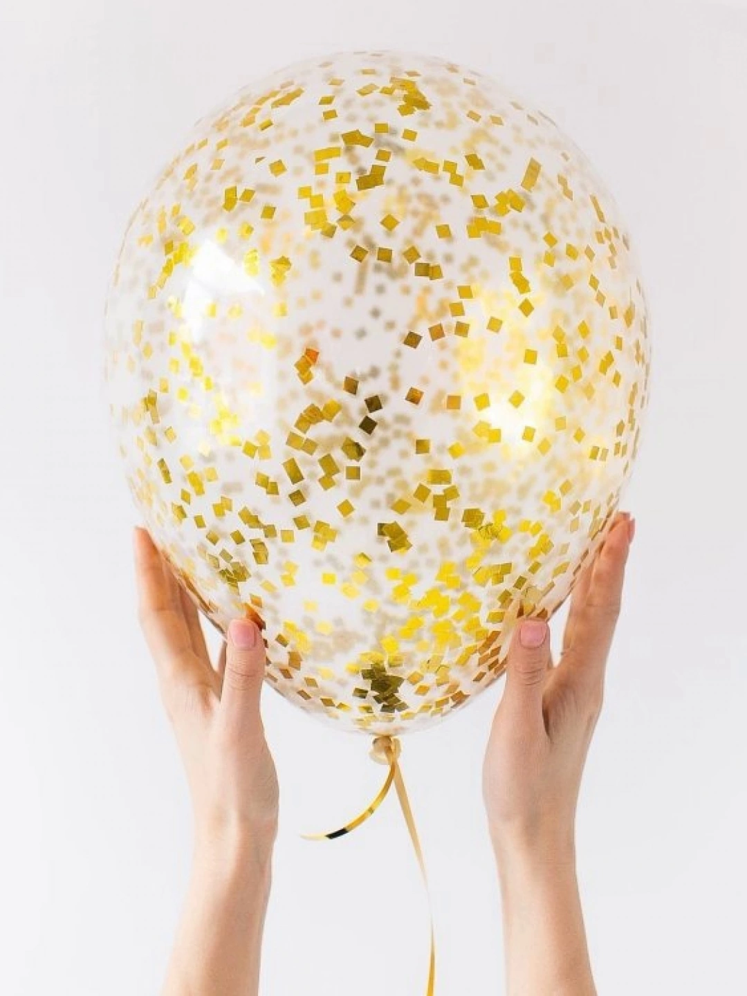 - 1 латексный шар прозрачный с золотым квадратным конфетти на ленте.
